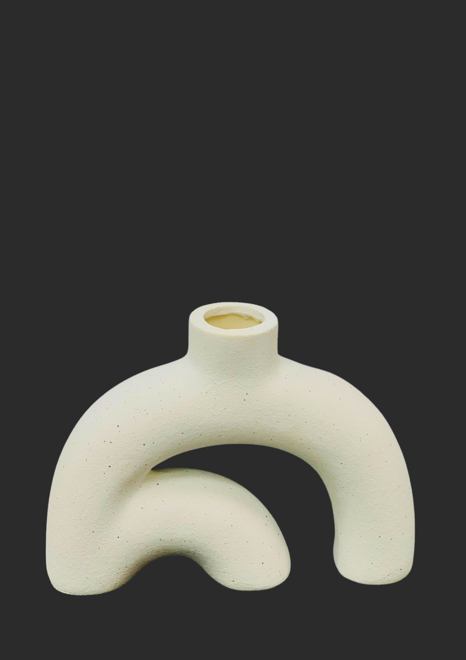 This captivating vase mimics the form of an abstract bridge or rainbow arch. Its low, wide profile (23cm width) and central opening make it a conversation starter on any coffee table or console. Finished in a speckled stone-like texture, it adds an earthy, grounded feel to modern decor. It is ideal for creative floral installations or simply as a sculptural object that celebrates form and negative space.