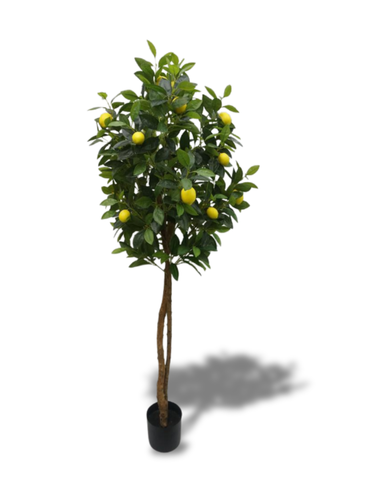 This premium artificial lemon tree offers a refreshing touch of nature without the maintenance. The plant features a realistic double-twisted wood-style trunk that supports a dense canopy of lush, dark green foliage and vibrant yellow lemons. Crafted from high-quality durable materials, the leaves and fruit have a detailed finish that mimics the texture of a real citrus tree. It comes secured in a standard black nursery pot, making it easy to place inside a decorative planter of your choice. Ideal for indoor environments such as living rooms, office corners, showrooms, or covered balconies, this tree remains evergreen and fresh-looking year-round with no watering or sunlight required.